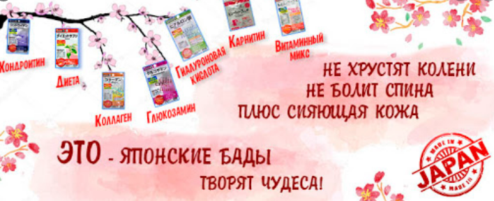 Лекарства будущего. В современной Японии осталось совсем немного аптек. Их практически заменили специализированные сети по продаже БАДов , сохраняющих и укрепляющих здоровье человека эффективными комплексами натуральных препаратов. Не упустите Ваш шанс прикоснуться к здоровью будущего сегодня! Японское долголетие. Японцы безусловные долгожители. Восемьдесят лет для современного японца — вполне обычный возраст. Такая продолжительность жизни достигается, в том числе, благодаря биодобавкам. Объем японского рынка БАДов в 2016 году превысил 9 млрд. долларов. Японцы не доверяют ни американским, ни европейским производствам. Они покупают лишь проверенные и по-настоящему действенные препараты внутреннего производства. Горные травы и морепродукты. В основе долголетия японцев лежат именно эти уникальные компоненты. Свежие натуральные морепродукты и целебные травы, собранные на склонах горы Фудзи под строжайшим контролем качества – сегодня эти сокровища в виде японских БАДов доступны и Вам! Высочайшее качество. Японские БАДы производятся исключительно для внутреннего рынка. Эти препараты не идут на экспорт. Требования внутреннего рынка Японии чрезвычайно высоки, потому продукты и биодобавки, продающиеся в Японии, отличает наивысшее качество, отраженное в здоровье нации. Степень очистки. В японских БАДах используется более очищенное сырье. Очистка происходит в нескольких специальных лабораториях, организованных при фармакологических университетах. Уровень очистки превосходит американские и европейские производства в 10-15 раз. Сертификация и Контроль. Все японские БАДы сертифицированы и одобрены министерством здравоохранения Японии. Министерство здравоохранения Японии каждый год составляет списки препаратов, рекомендованных к применению при тех или иных расстройствах, отклонениях, заболеваниях. В Японии нет взяток и коррупции – потому сертификаты говорят сами за себя. Помимо японских сертификатов, все производители имеют сертификаты ISO 9001 и HACCP. В Японии исключены пустышки. Большинство БАДов и даже лекарств, которые продают в СНГ, России и зачастую в Европе — это пустышки. Тальк, крахмал или сахар обычно не приносит вреда, но и не несет никакой пользы. В Японии подобная ситуация невозможна. Компанию, которую уличат в обмане, закроют незамедлительно.