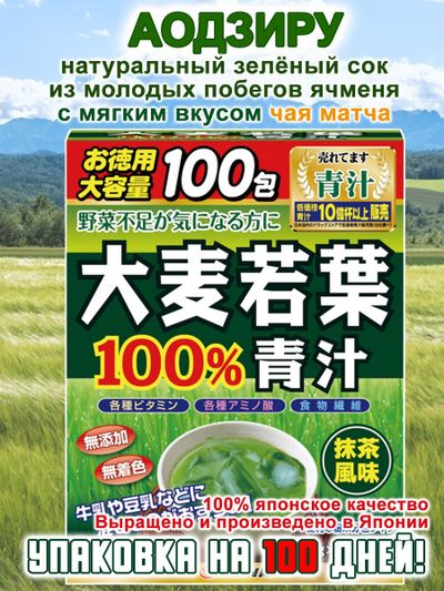 Аодзиру зеленый сок из листьев молодого ячменя со вкусом чая Матча 2г 100 шт. Восполнить дефицит витаминов и микроэлементов в организме поможет японский YUWA Аодзиру. Он улучшится самочувствие, укрепит иммунную систему, придаст дополнительную энергию. Природная натуральная витаминная бомба. Состав японского витамина представлен безопасными и тщательно проверенными компонентами. Сохраняет здоровье зубов, положительно сказывается на состоянии опорно-двигательного аппарата. 2. Железо. Стимулирует кровообращение, благодаря чему клетки получаются дополнительный кислород. Снижает риск развития анемии. 3. Калий. Избавляет от ночных судорог, повышает остроту зрения.
